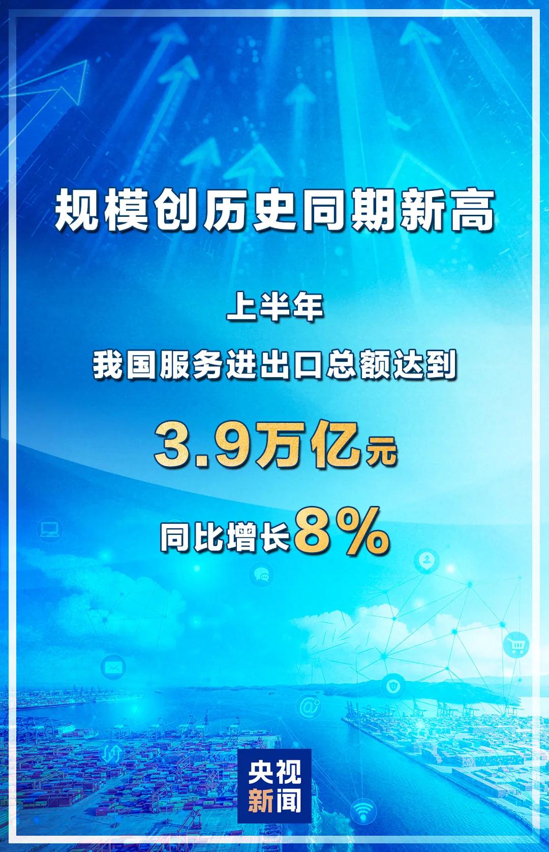 发布会上介绍,今年上半年,我国服务进出口总额达3.9万亿元,同比增长8%,规模创历史同期新高。